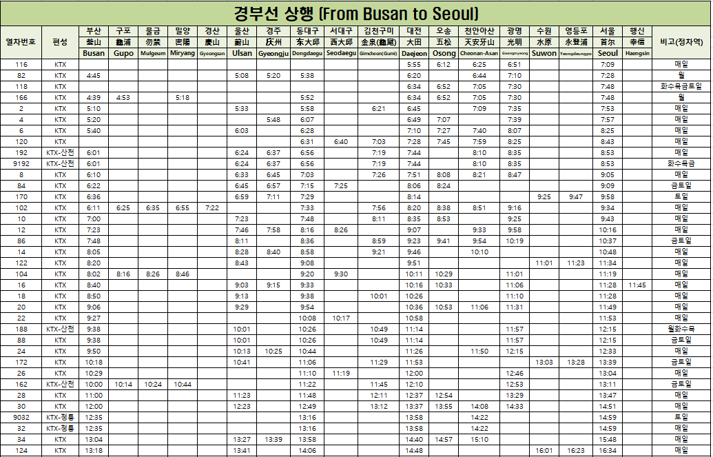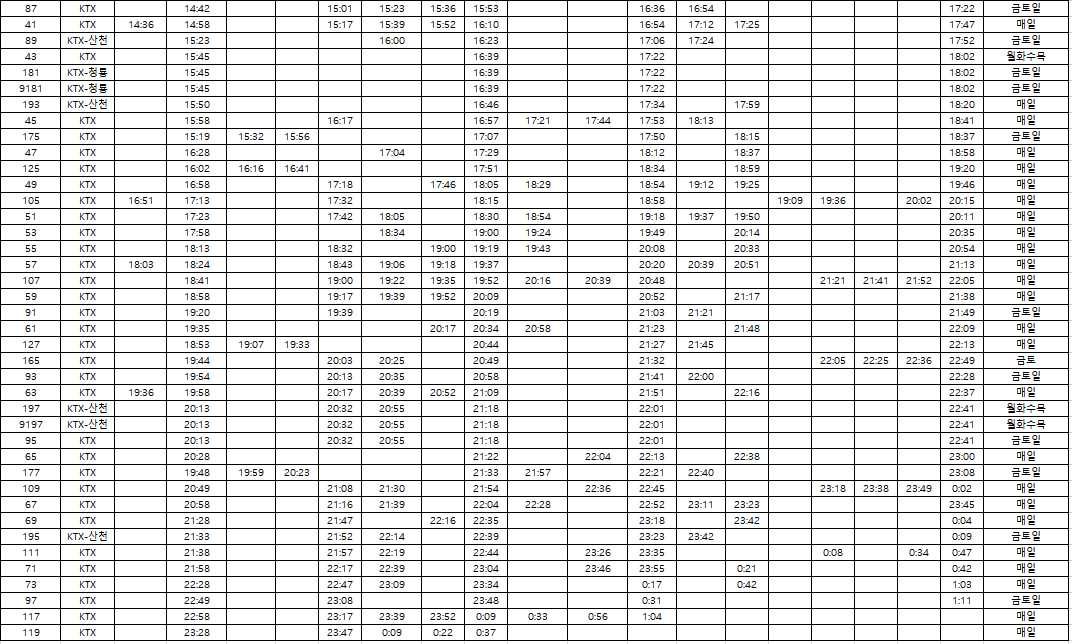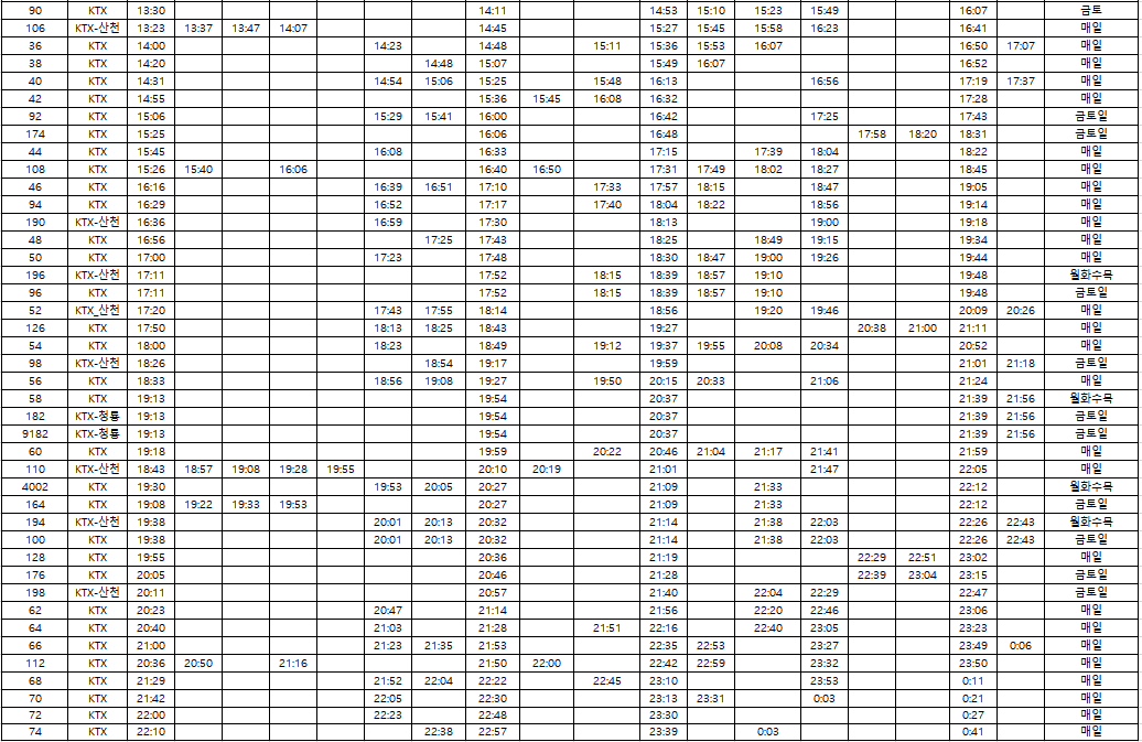 | KTX 110 | 15:00 | 17:30 | 2시간 30분 | 대전, 대구 |