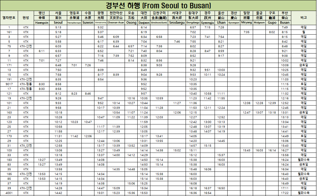 | KTX 101 | 06:00 | 08:30 | 2시간 30분 | 대전, 대구 |