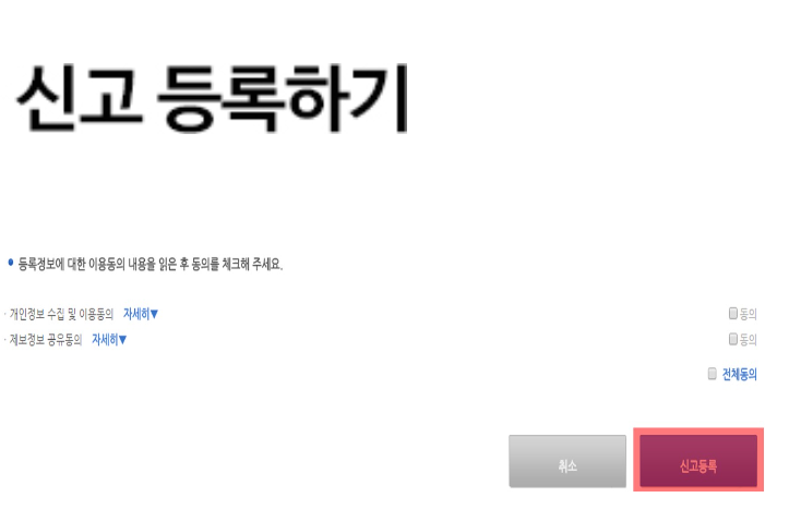 입력이 완료되셨으면 신고 등록 하기 버튼을 눌러주시면 신고가 완료됩니다.