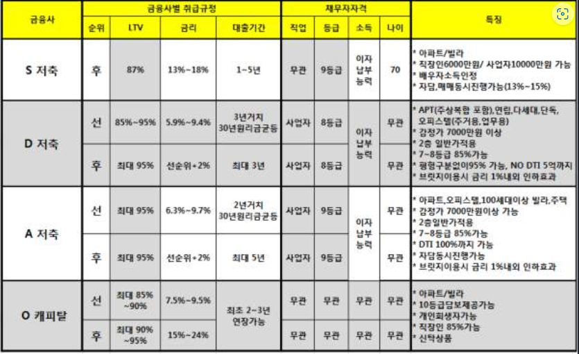 같은 케이스라도 워낙 금융사가 많고, 상품 가이드도 내용이 다르므로, 상품별로 나오는 수치도 달라질 수 있습니다. 캐피탈사나 저축은행권은 비교적 부동산 담보대출 한도 수치가 제법 많이 나오는 업권입니다. 실제 사업자 위주로 진행이 되며, 매출의 확인과 3개월 이상의 업력을 필요로 합니다.