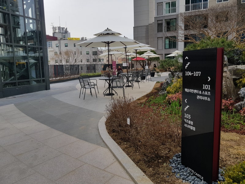 아파트 단지의 야외 공간입니다. 편안한 분위기에서 휴식을 취할 수 있습니다.