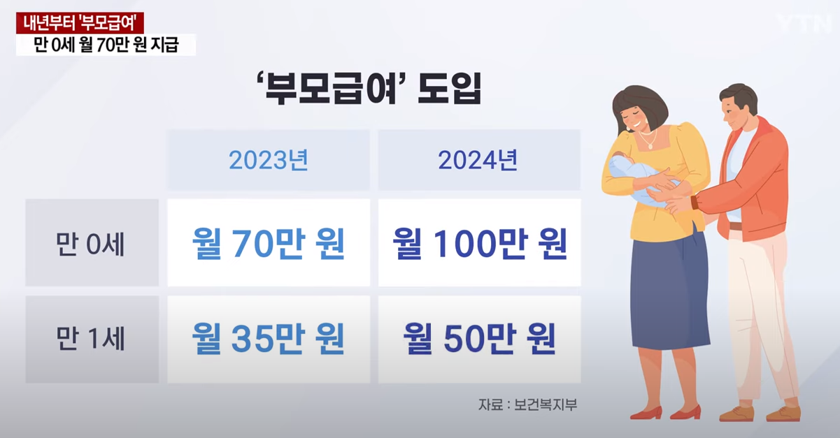 부모 급여를 도입하여 0세를 기준으로 2023년에는 70만 원 2024년에는 100만 원까지 지원을 확대해 나갈 예정입니다.