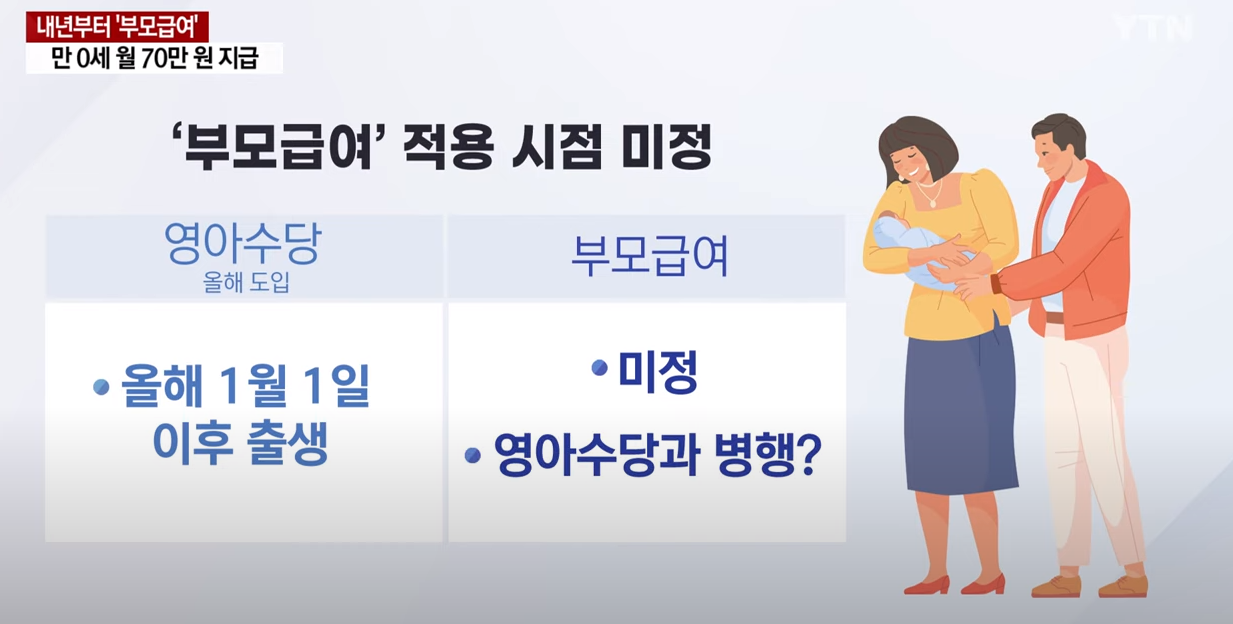 내년부터 만 0세 자녀를 둔 부모는 매달 70만 원의 부모 급여를 받게 됩니다.