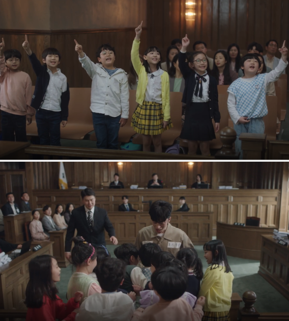 강기영(정명석)과 우영우는 학부모들을 설득하기 위해 묘수를 던졌습니다. 서울대 출신과 변호사 직업을 내세워 법정 견학이 아이들에게 도움이 될 수 있다며 학부모들의 흥미를 끄는 데 성공했고, 아이들이 방구뽕의 최후 변론에 참석할 수 있도록 한 것. 방구뽕의 최후 진술은 어린이 해방 선언문이었습니다.