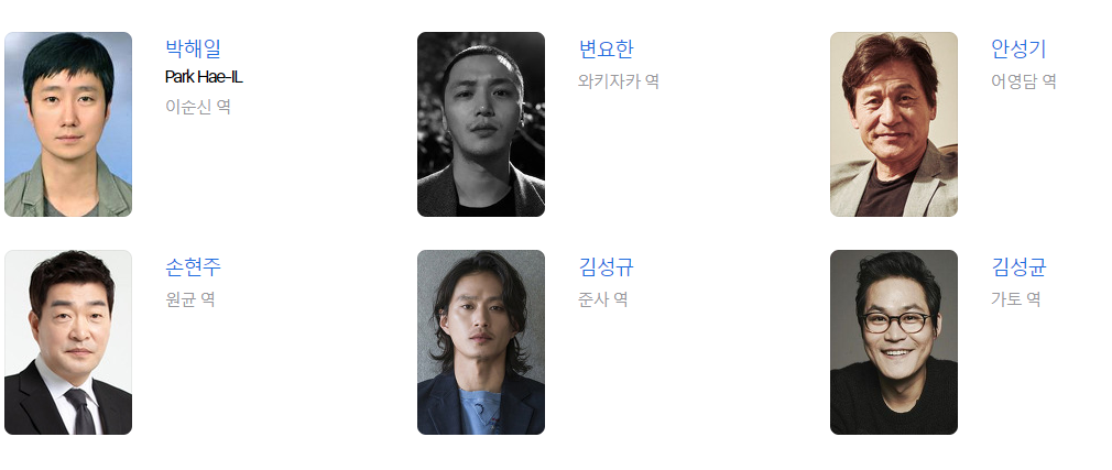 영화 <한산: 용의 출현>에 박해일, 변요한, 안성기, 손현주, 김성규, 김성균, 김향기, 옥택연, 공명, 박지환까지 두 세대를 뛰어넘는 넓은 스펙트럼의 배우들이 캐스팅됐다. 전작 <명량>에 이어 김한민 감독의 날카로운 캐스팅 감각이 영화 <한산: 용의 출현>에도 반영됐다.