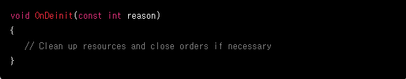 6. OnDeinit 함수를 생성합니다. 이 함수는 EA가 차트에서 제거될 때 호출됩니다.