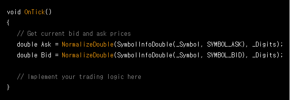 7. OnTick 함수를 생성합니다. 이 기능은 새로운 가격 견적이 수신될 때마다 실행됩니다.