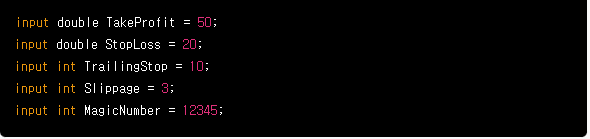 4. 외부 변수를 정의합니다. 이러한 변수를 통해 사용자는 코드를 수정하지 않고도 EA의 설정을 쉽게 수정할 수 있습니다. 예를 들어: